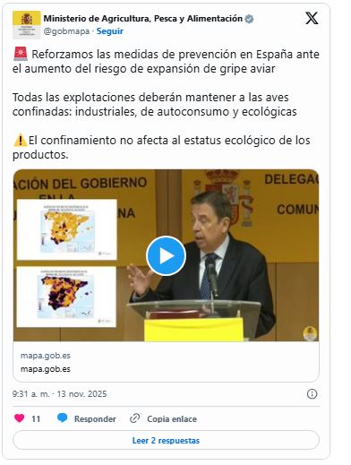 «Son medidas temporales que van a proseguir, en la medida en que sean necesarias para evitar esta situación, donde además del confinamiento se determina evitar el contacto con los comederos y bebederos de estas instalaciones para evitar que las aves silvestres sean un vector de contagio», dijo el ministro del Ramo, Luis Planas.