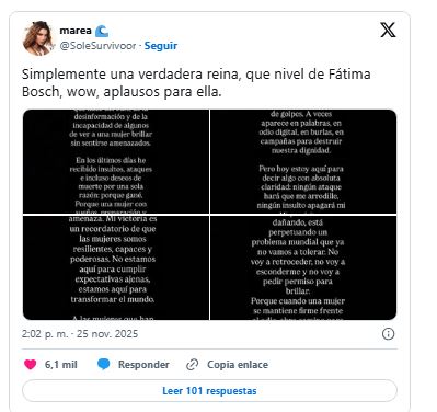«Hoy quiero alzar la voz no como una reina de belleza, sino como una mujer. Una mujer que, como millones en el mundo, ha vivido en carne propia la violencia que nace del odio, de la desinformación y de la incapacidad de algunos de ver a una mujer brillar sin sentirse amenazados», manifestó. Además, reveló: «En los últimos días he recibido insultos, ataques e incluso deseos de muerte por una sola razón: porque gané. Porque una mujer con sueños, preparación y corazón decidió ponerse de pie y luchar por lo que ama».