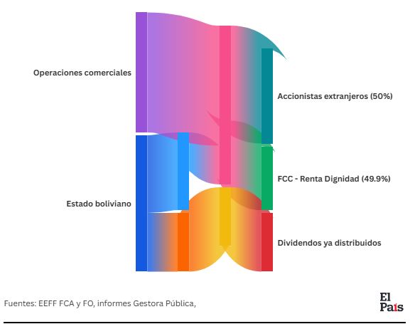 Entre 1996 y 2024, el FCC recibió aproximadamente Bs 205,6 millones en dividendos de ambas empresas: Bs 95,7 millones de Andina y Bs 109,9 millones de Oriental. Considerando que los subsidios estatales totales fueron Bs 250,5 millones y que el FCC posee 49,9% de ambas empresas, aproximadamente Bs 125 millones de los dividendos recibidos por el FCC provienen directa o indirectamente de subsidios estatales.