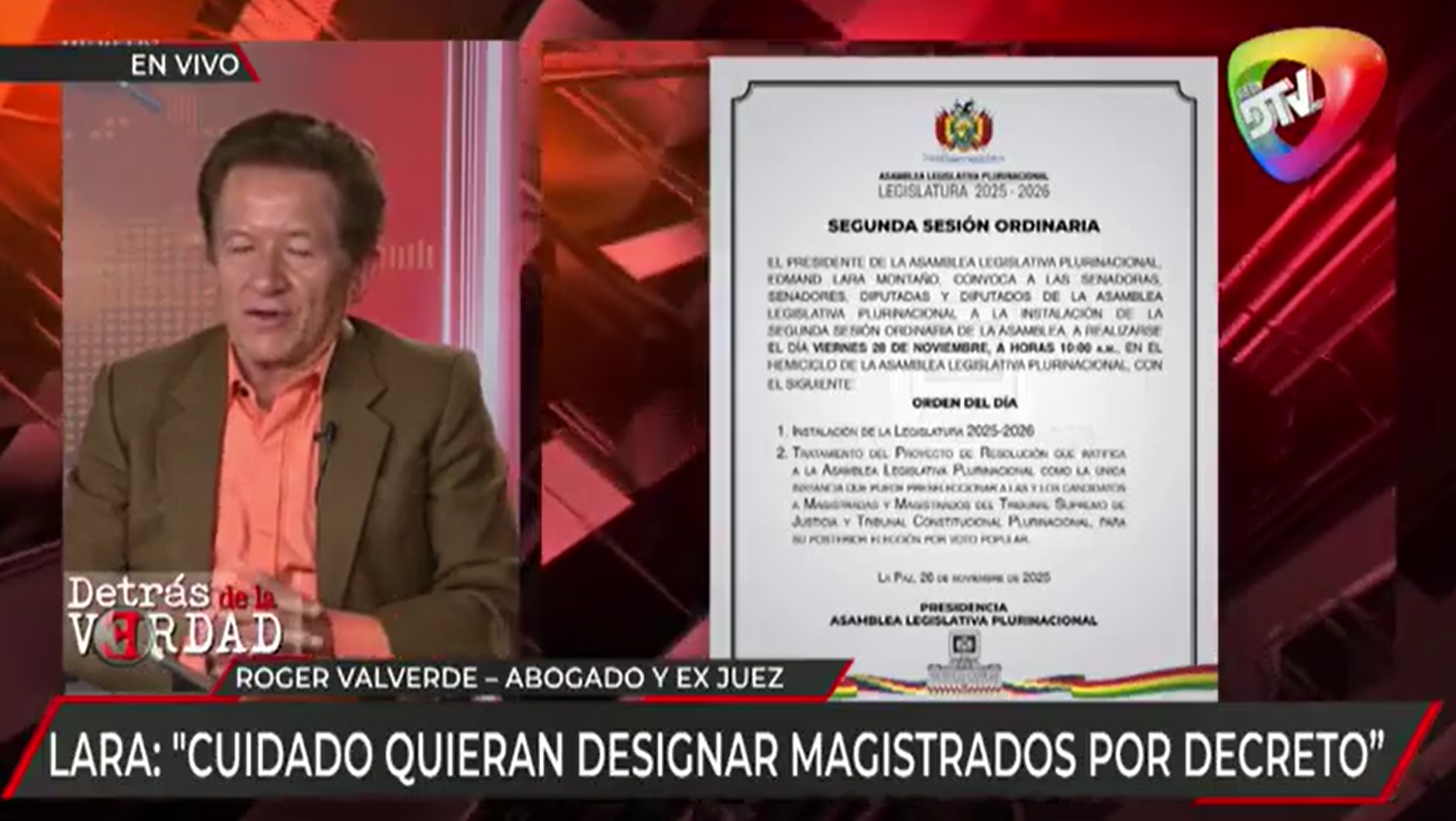 El exjuez y abogado constitucionalista Roger Valverde refutó las declaraciones del vicepresidente Edmand Lara, quien aseguró que la única salida a la crisis del Tribunal Constitucional Plurinacional (TCP) es que la Asamblea Legislativa Plurinacional (ALP) lance una nueva convocatoria a elecciones judiciales para llenar las acefalías y afirmó que existen ‘alternativas legales y políticas’, entre ellas, la activación de suplencias y designaciones provisionales por Decreto Supremo.