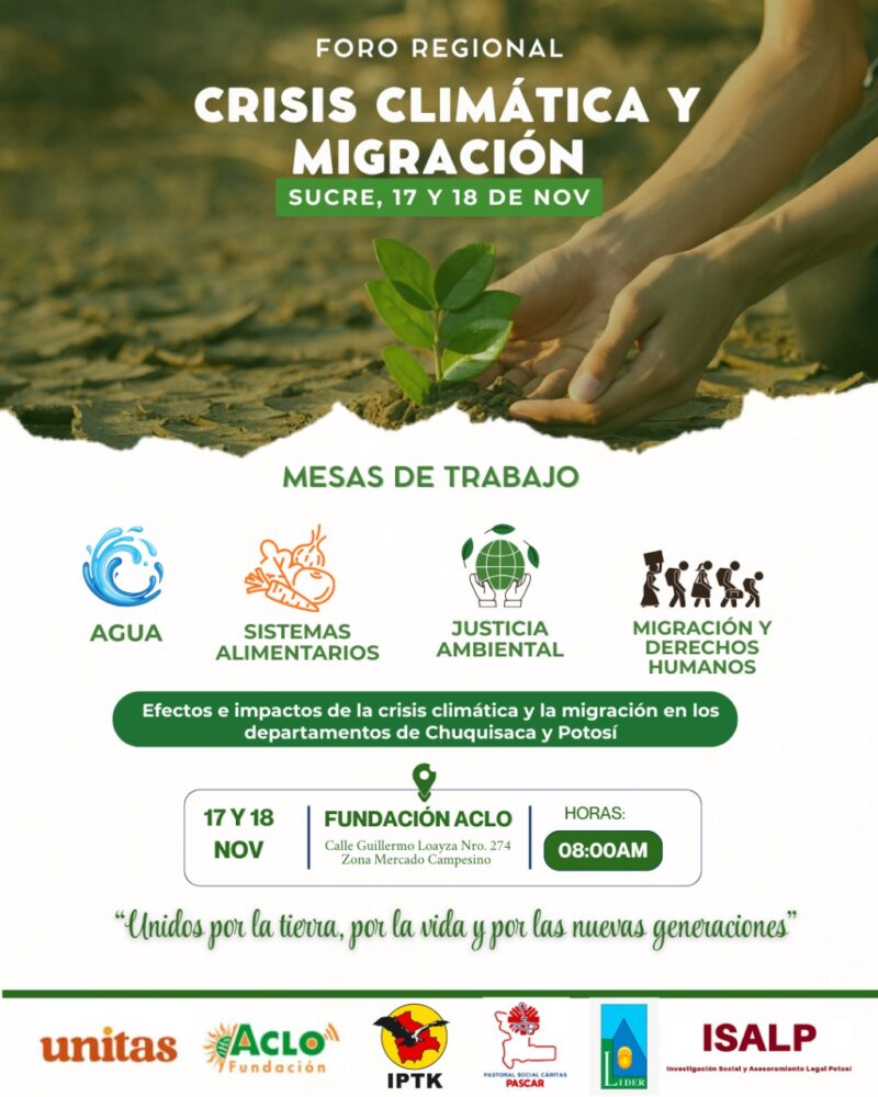 El Foro Regional de Experiencias en Crisis Climática y Migración 2025, que se lleva a cabo este lunes 17 y martes 18 en Sucre, es organizado por la Red Departamental Chuquisaca-Potosí.