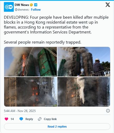 Al menos cuatro personas murieron y ocho resultaron heridas este miércoles (26.11.2025) en un incendio de gran magnitud en el complejo residencial Wang Fuk Court, en el distrito de Tai Po, en el norte de Hong Kong, donde las llamas se propagaron por el andamiaje de bambú instalado en un bloque.