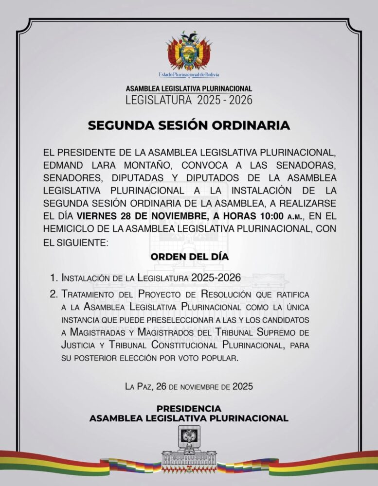 Este miércoles, Lara convocó a la segunda sesión ordinaria del pleno de la ALP para el tratamiento del proyecto de resolución que ratifica a la Asamblea como “la única instancia” que puede preseleccionar a los candidatos del TCP y TSJ. Libre señaló que Lara no puede llamar a sesión “basándose únicamente en suposiciones o temores sobre una eventual designación de magistrados por decreto por parte del presidente Rodrigo Paz”.
