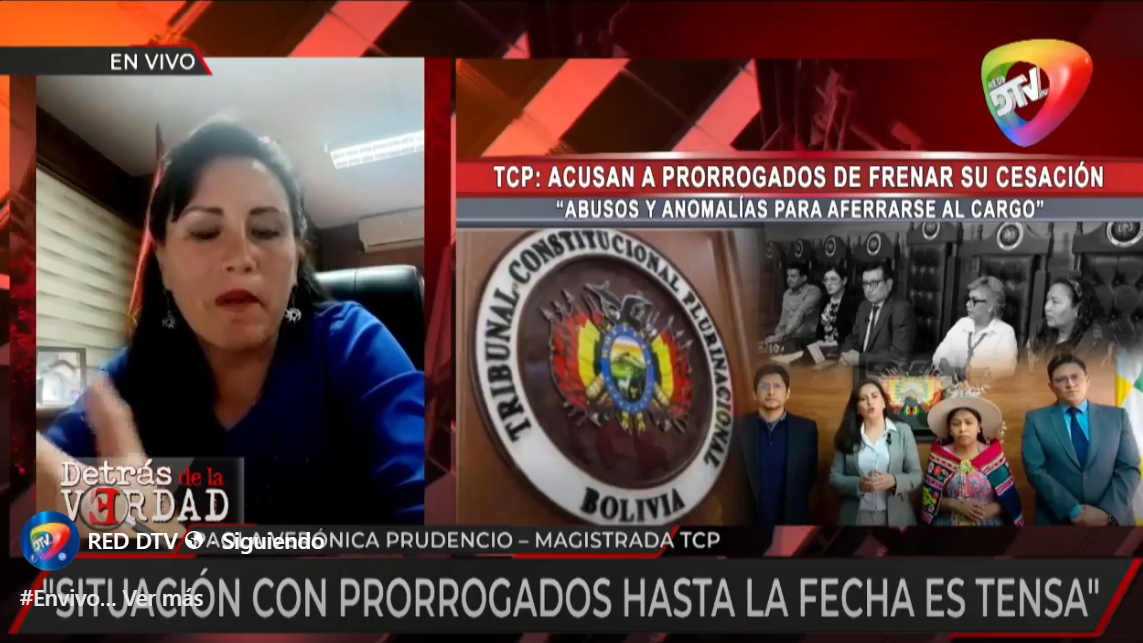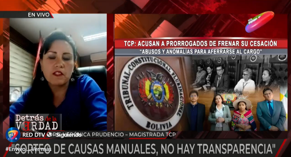 Paola Verónica Prudencio afirma que cinco magistrados continúan en el cargo ‘de manera inconstitucional’, bloquean reformas internas y mantienen el control del Tribunal Constitucional mediante sentencias ‘en causa propia’.