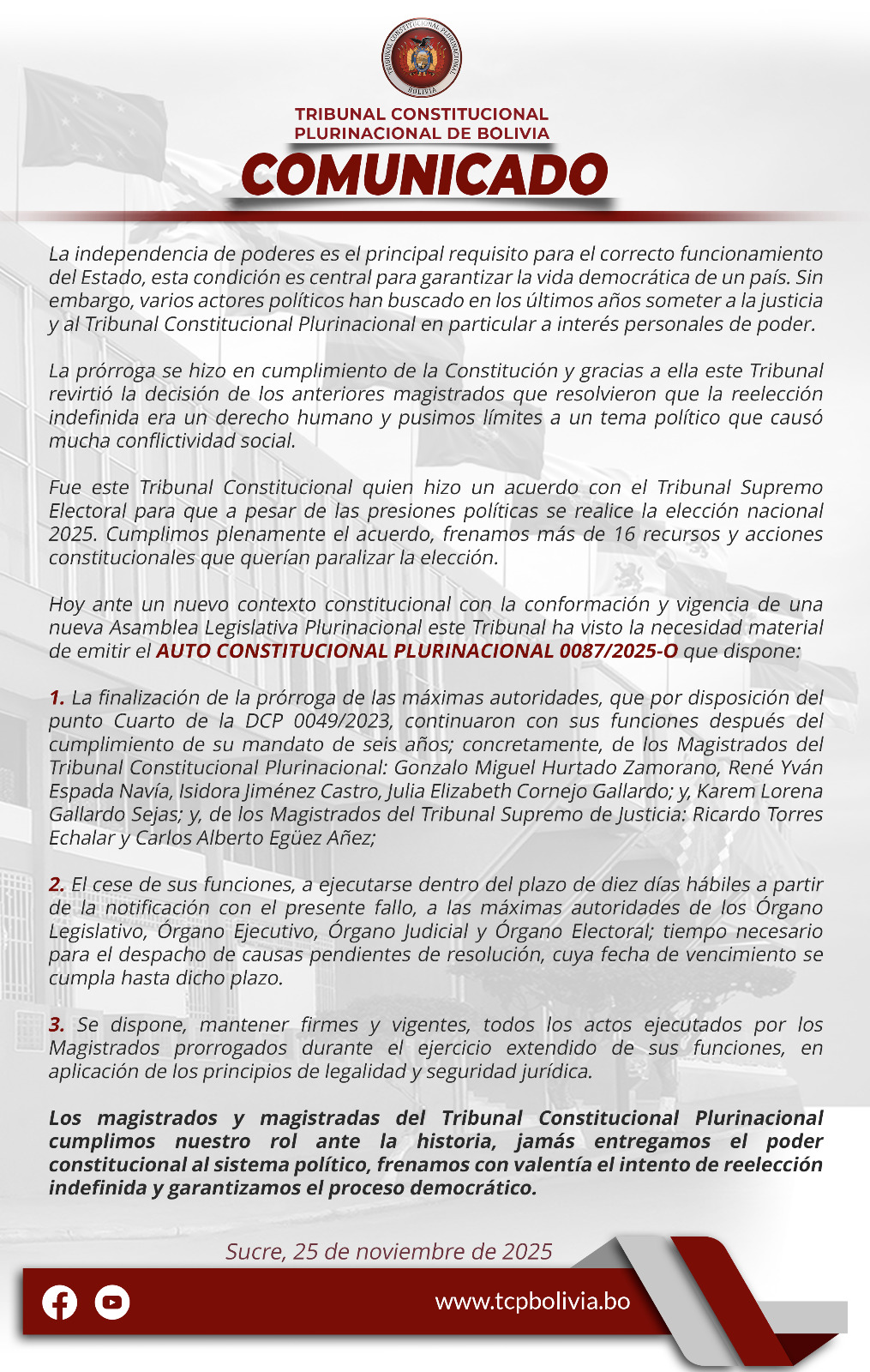 El auto constitucional plurinacional 0087/2025-O ordena el cese de los magistrados prorrogados del tribunal constitucional Gonzalo Miguel Hurtado Zamorano, René Yván Espada Navía, Isidora Jiménez Castro, Julia Elizabeth Cornejo Gallardo y Karem Lorena Gallardo Sejas.