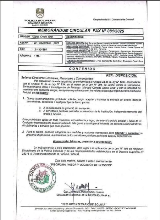 El día después de su posesión, el comandante general de la Policía Boliviana, Mirko Sokol, emitió un memorándum a los miembros del verde olivo, en el marco de la lucha contra la corrupción que anticipó durante su posesión que se realizó el viernes.