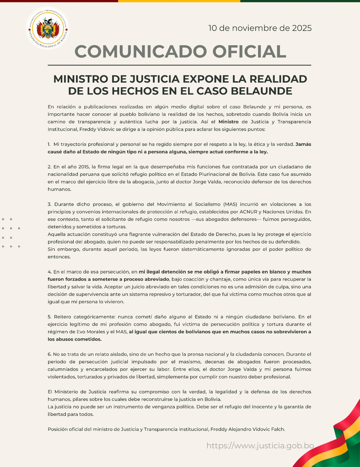 En relación a publicaciones realizadas en algún medio digital sobre el caso Belaunde y mi persona, es importante hacer conocer al pueblo boliviano la realidad de los hechos, sobretodo cuando Bolivia inicia un camino de transparencia y auténtica lucha por la justicia. Así el Ministro de Justicia y Transparencia Institucional, Freddy Vidovic se dirige a la opinión publica para aclarar los siguientes puntos: