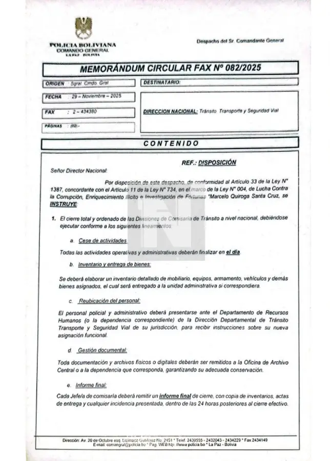 Durante la jornada de este sábado, comenzó a circular un memorándum emitido por el Comando General de la Policía Boliviana y dirigido a la Dirección Nacional de Tránsito, Transporte y Seguridad Vial, en el que se dispone el cierre total y ordenado de las Divisiones de Comisaría de Tránsito en todo el país.