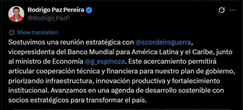 El presidente Rodrigo Paz sostuvo una «reunión estratégica» con el Banco Mundial para articular la cooperación que recibirá el país por parte del organismo internacional.