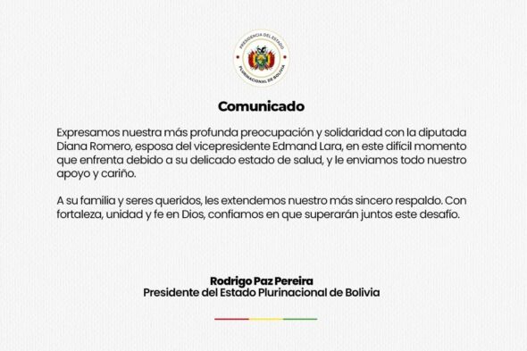 «Expresamos nuestra más profunda preocupación y solidaridad con la diputada Diana Romero, esposa del vicepresidente Edmand Lara, en este difícil momento que enfrenta debido a su delicado estado de salud, y le enviamos todo nuestro apoyo y cariño», enfatizó Paz en un mensaje dirigido a la legisladora y su familia.