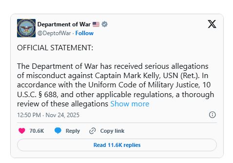 En un comunicado publicado este lunes en X, el Pentágono dijo que recibió «graves acusaciones» sobre la conducta del «capitán Mark Kelly, retirado de la Marina de Estados Unidos» y astronauta de la NASA.