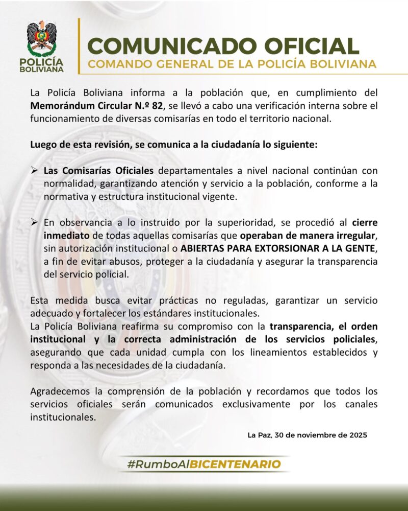 “Se procedió al cierre inmediato de todas aquellas comisarías que operaban de manera irregular, sin autorización institucional o ABIERTAS PARA EXTORSIONAR A LA GENTE, a fin de evitar abusos, proteger a la ciudadanía y asegurar la transparencia del servicio policial”, señala el comunicado.