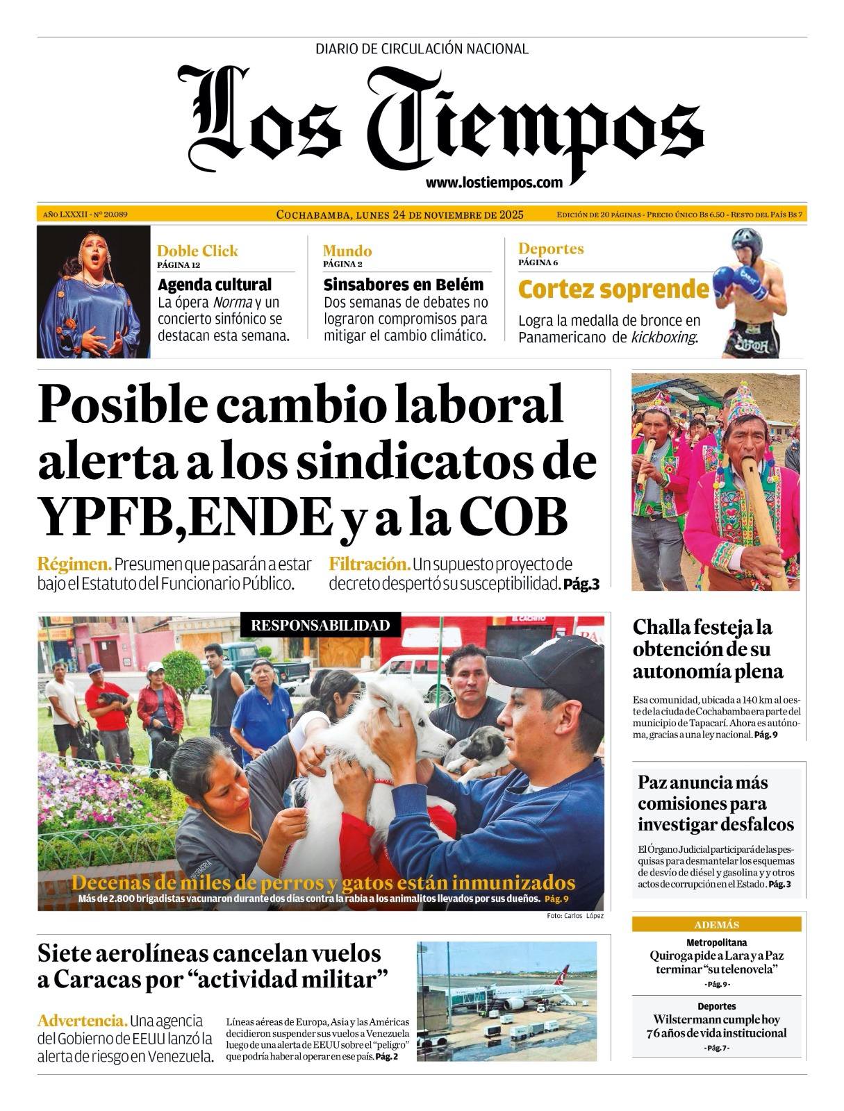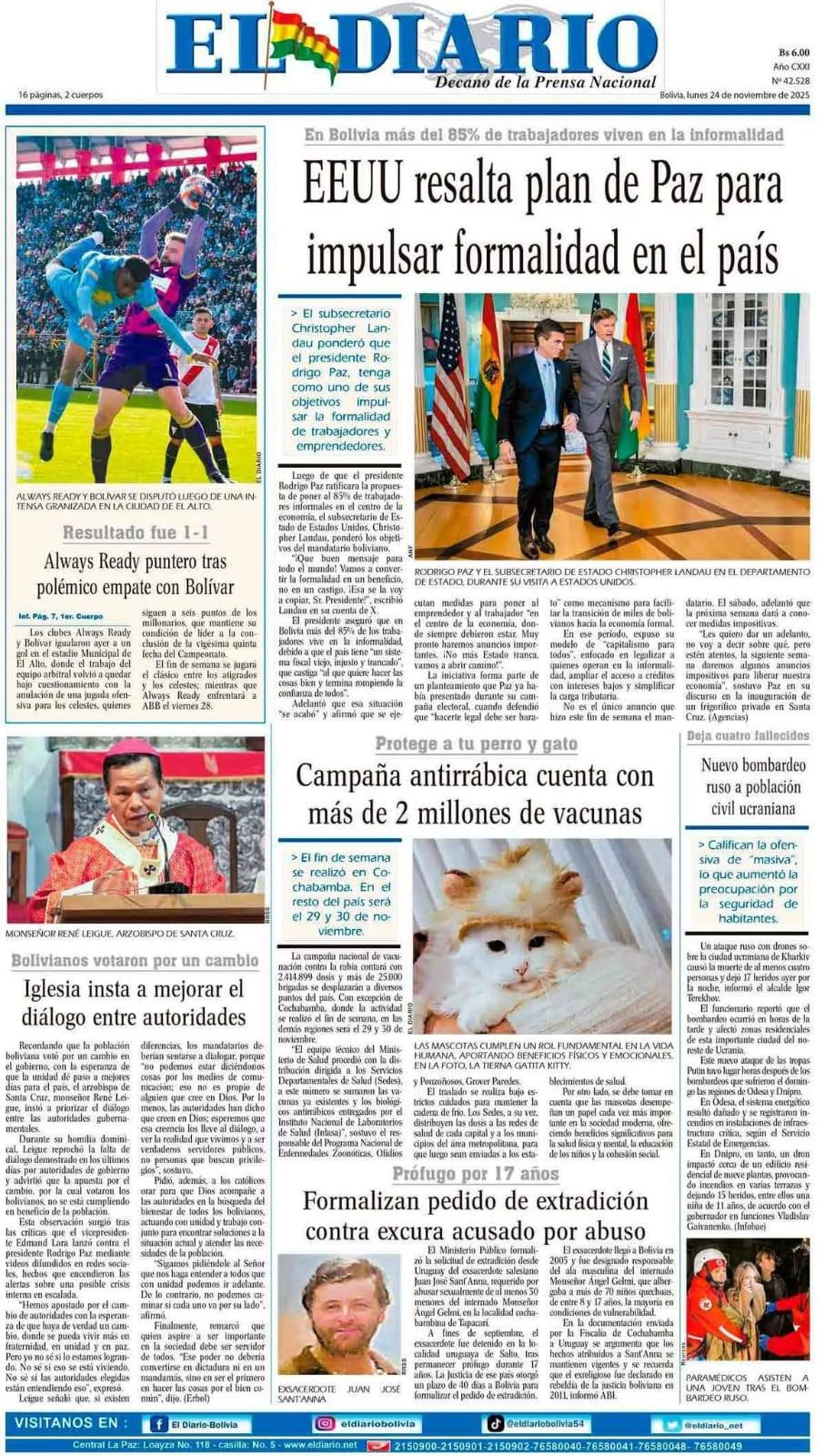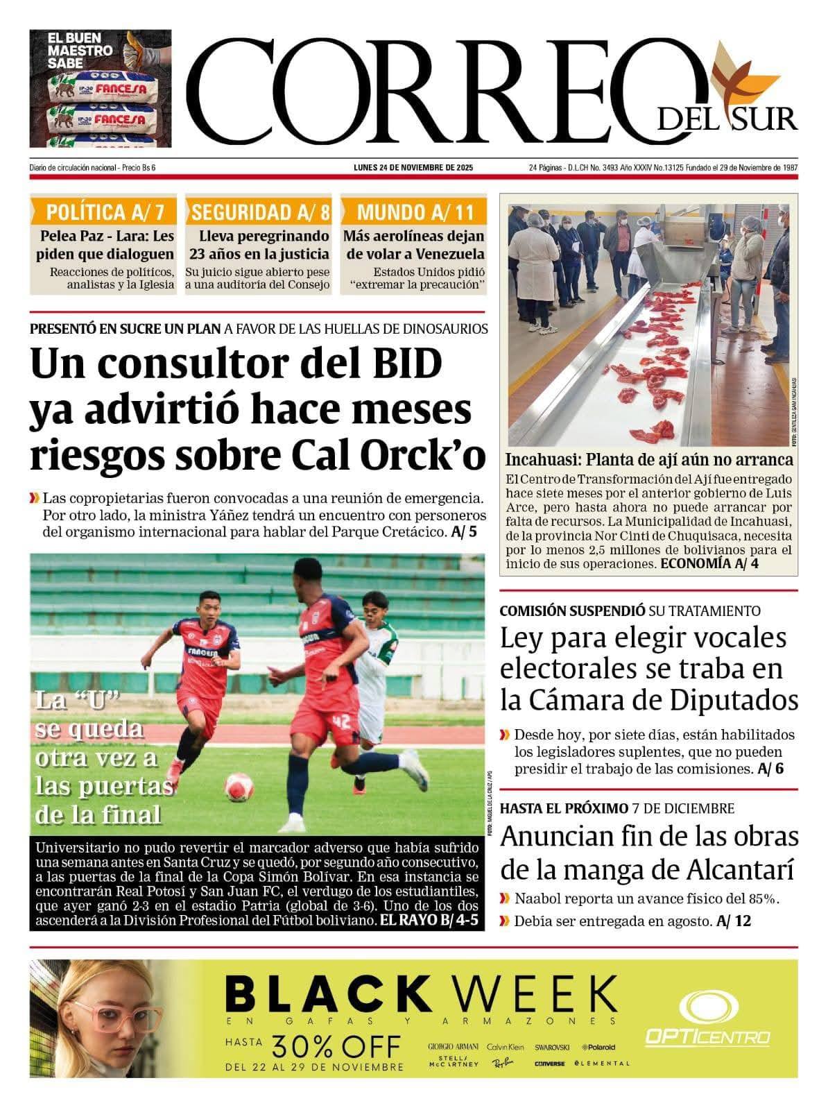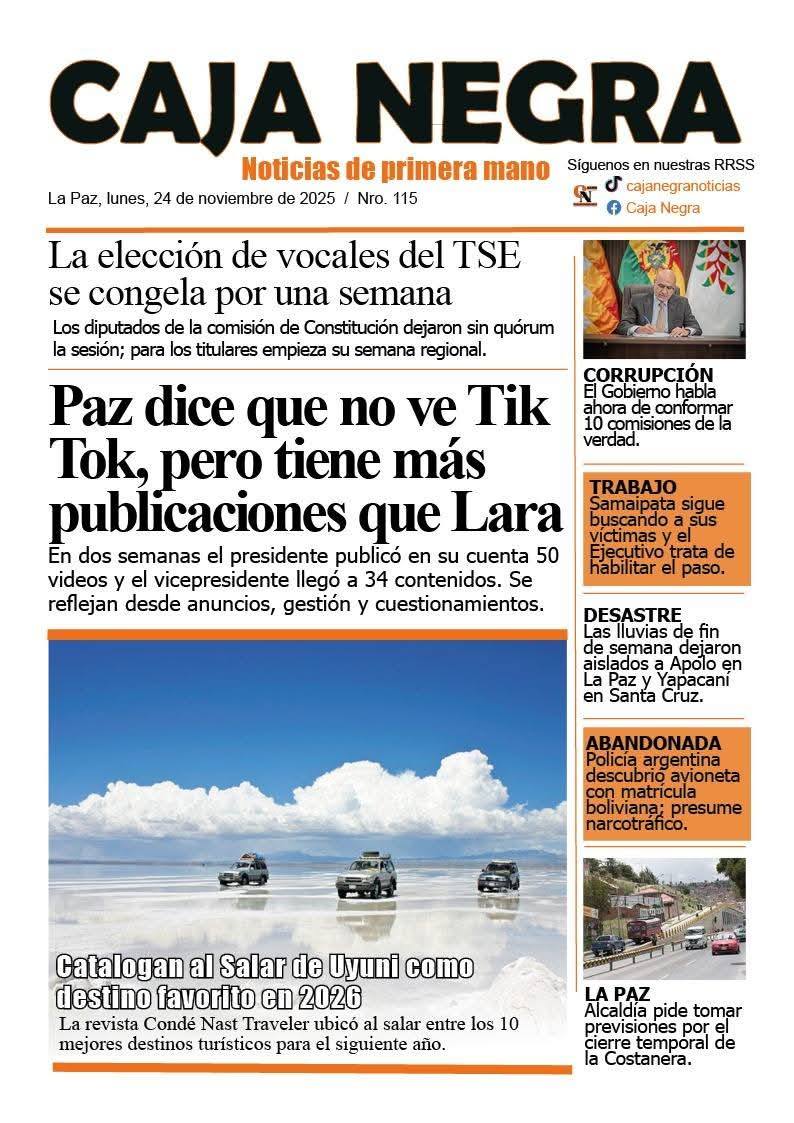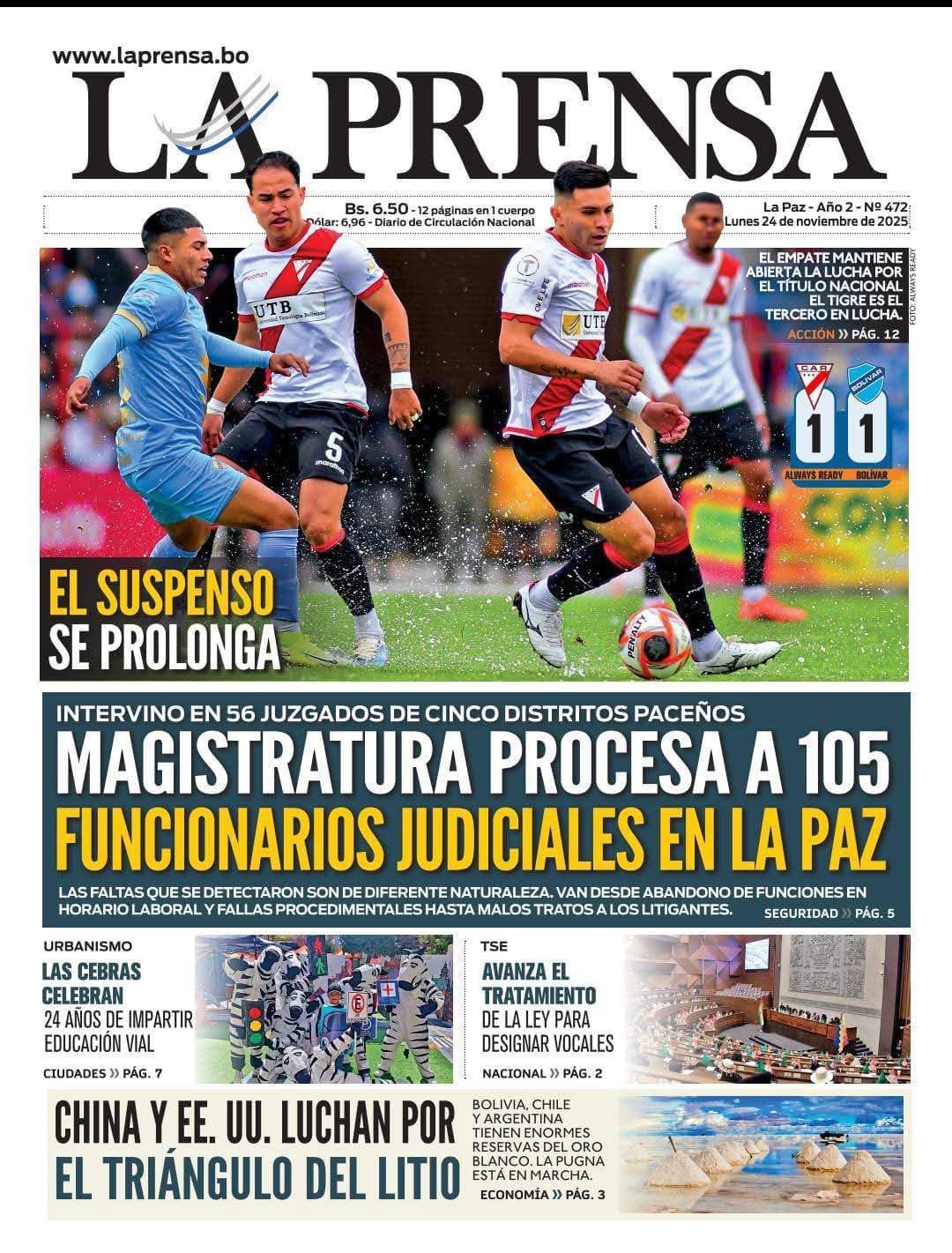 Portadas de los periódicos de Bolivia del lunes 24 de noviembre del 2025