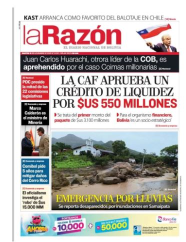 Fuente: El Deber, El Día, Zona Norte, La Palabra, La Razón, El Alteño, La Prensa, Ahora El Pueblo, La Estrella del Oriente, El Mundo, Los Tiempos, La Voz, Contraparte, Andaluz, El Potosí, Correo del Sur, El País, El Periódico, El Diario, Amitel Pres, Opinión, Caja Negra, Novavox.