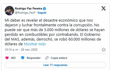 En días pasados, Rodrigo Paz reportó deudas no registradas, compras irregulares y presuntos desfalcos millonarios, asegurando que se recaban “pruebas suficientes para que estos hechos de corrupción no queden impunes”.