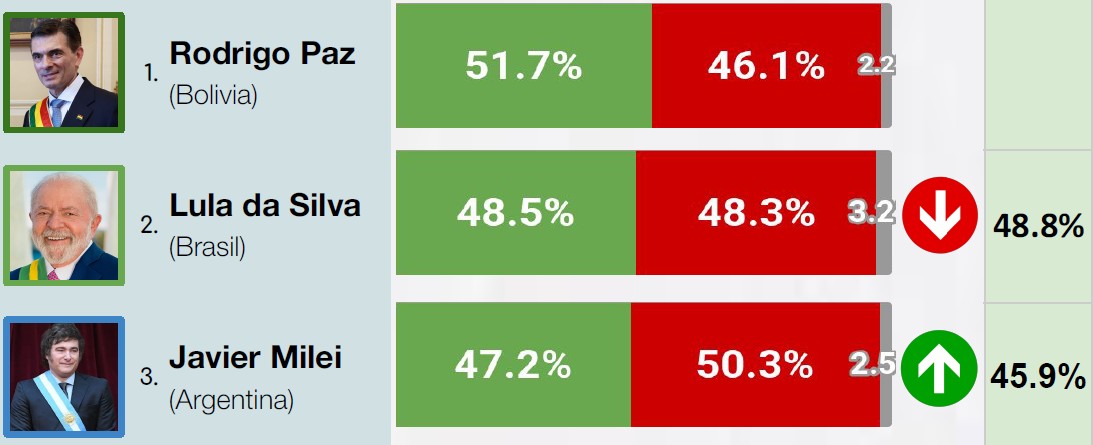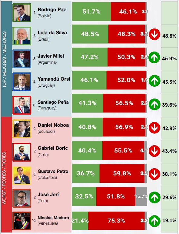 El Ranking de Presidentes de Sudamérica noviembre 2025 ubica al mandatario boliviano Rodrigo Paz Pereira al tope del conteo, con un 51,7% de imagen positiva entre todos los jefes de Estado de la región.