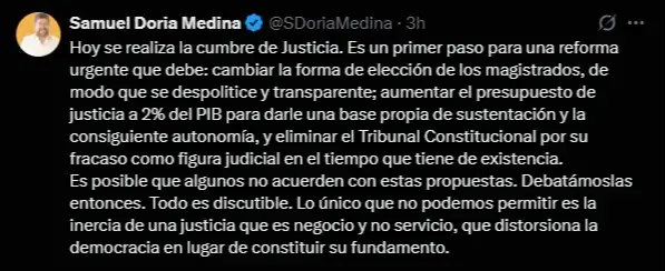 En el marco de la Cumbre de Justicia que se realiza este viernes, el empresario y líder político Samuel Doria Medina planteó una serie de propuestas destinadas a impulsar una reforma estructural y urgente del sistema judicial boliviano. A través de un mensaje público, destacó tres pilares fundamentales que, a su criterio, deben guiar el proceso de transformación.