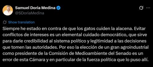 «Siempre he estado en contra de que los gatos cuiden la alacena. Evitar conflictos de intereses es un elemental cuidado democrático, que sirve para darle credibilidad al sistema político y legitimidad a las decisiones que tomen las autoridades», publicó Doria Medina en sus redes sociales.
