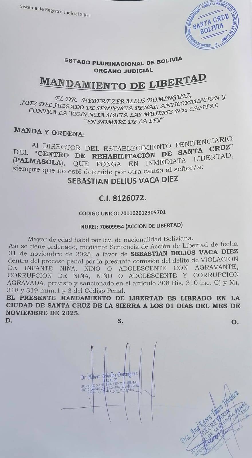 Tras una serie de incidentes y maniobras jurídicas de parte de la defensa del acusado, el proceso se estaba desarrollando en los juzgados de la capital oriental, con la presentación de todas las pruebas de parte de la representación de la víctima. Sin embargo, el juez Hebert Zeballos Domínguez, mediante la resolución fechada el 1 de noviembre de 2025, instruyó al director del penal de Palmasola disponer la inmediata liberación de Delius, «siempre que no tenga otra causa pendiente». La orden se sustenta en una Sentencia de Acción de Libertad emitida a su favor.