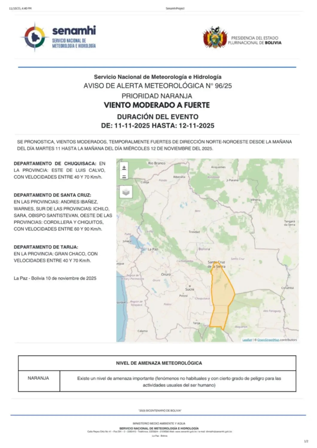 El Servicio Nacional de Meteorología e Hidrología (Senamhi) emitió un aviso de alerta meteorológica de prioridad Naranja. Esta alerta se debe a la previsión de vientos moderados a temporalmente fuertes de dirección norte-noroeste que impactarán significativamente a tres departamentos del país. El fenómeno se espera desde la mañana del martes 11 hasta la mañana del miércoles 12 de noviembre de 2025.