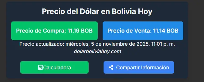 Según datos emitidos la noche de este miércoles 5 de noviembre de 2025, por el portal especializado dolarboliviahoy.com, la divisa estadounidense se cotiza en el mercado paralelo con un precio a la venta de 11.14 (BOB), y un precio de compra de 11.19 (BOB).
