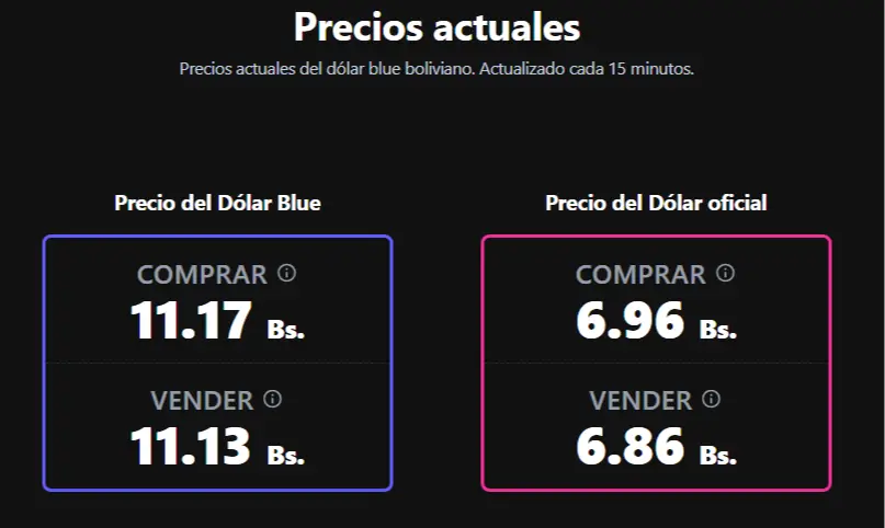 Por otro lado, según datos obtenidos por el sitio https://bolivianblue.net/#google_vignette, el dólar blue boliviano que se actualiza cada 15 minutos, cotiza este miércoles por la tarde una variación, ya que a la compra se registra en 11.17 (BOB), y 11.13 (BOB), para la venta.