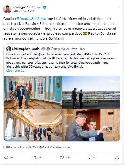 Todo esto lo acompañó recompartiendo el post del subsecretario de Estado de Estados Unidos, Christopher Landau, quien subió a sus redes sociales parte de la visita del presidente electo de Bolivia a EEUU y escribió: «Tuve el honor y el placer de recibir hoy al presidente electo de Bolivia, Rodrigo Paz, y a su delegación en la oficina del Departamento de Estado. Mantuvimos una excelente conversación sobre cómo nuestros países pueden retomar su larga cooperación y amistad tras 20 años de distanciamiento. ¡Viva Bolivia! ¡Viva Estados Unidos!»