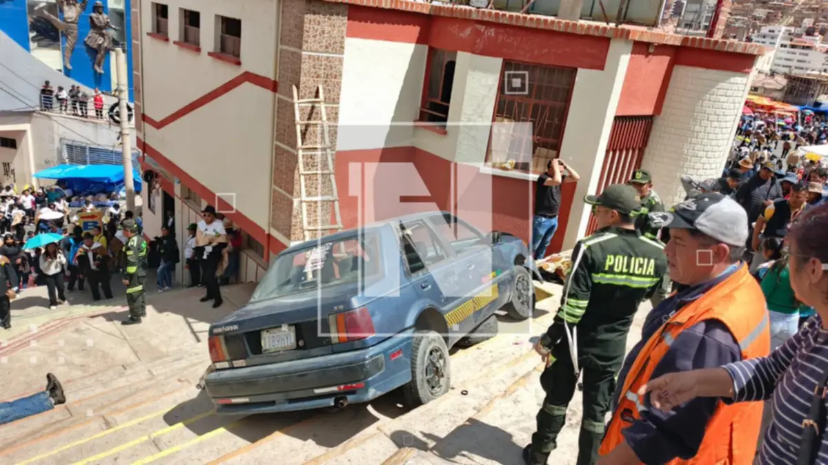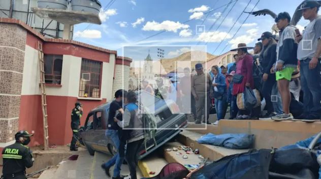 Un vehículo particular de color azul oscuro terminó empotrado en la escalinata principal de la zona, en un hecho que, según un reporte extraoficial, dejó como saldo una persona fallecida y varios heridos, además de daños en los puestos de venta. Según se conoció, la causa sería un problema en los frenos.