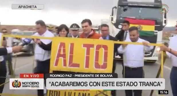 La tarde de este domingo, el presidente Rodrigo Paz se trasladó hasta la zona de La Apacheta, en la carretera La Paz–Oruro, para encabezar el ingreso de un convoy de cisternas que transporta combustible hacia la planta de Senkata, en la ciudad de El Alto, «Adiós Estado tranca»