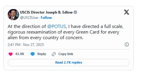 Joseph Edlow, director del Servicio de Ciudadanía e Inmigración de Estados Unidos (USCIS), dijo en X: «He ordenado una reexaminación rigurosa y a gran escala de cada Tarjeta Verde para cada extranjero de cada país de preocupación».