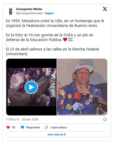 Maradona expresó en varias ocasiones su respaldo a la educación pública y gratuita. Su apoyo más recordado se remonta a los años 90, cuando intervino públicamente en defensa del sistema universitario, en un contexto de fuerte tensión por los recortes presupuestarios.