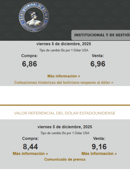 El Banco Central de Bolivia (BCB) informó a la población que con el fin de ofrecer una referencia clara y confiable que refleje las operaciones reales del sistema financiero, publicará diariamente el valor referencial del dólar estadounidense (USD), con base en las operaciones efectivas de compra y venta realizadas por las Entidades de Intermediación Financiera (EIF).