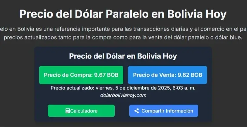 Según datos emitidos este 5 de diciembre de 2025 por el portal especializado dolarboliviahoy.com, la divisa estadounidense se cotiza en el mercado paralelo con un precio a la venta de 9.62 (BOB) y un precio de compra de 9.67 BOB.