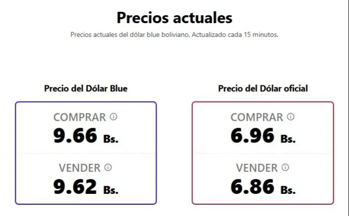 Por otro lado, según datos obtenidos por el sitio https://bolivianblue.net/#google_vignette, el dólar blue boliviano, que se actualiza cada 15 minutos, cotiza este viernes una variación, ya que a la compra se registra en 9.66 (BOB) y 9.62 (BOB) para la venta.