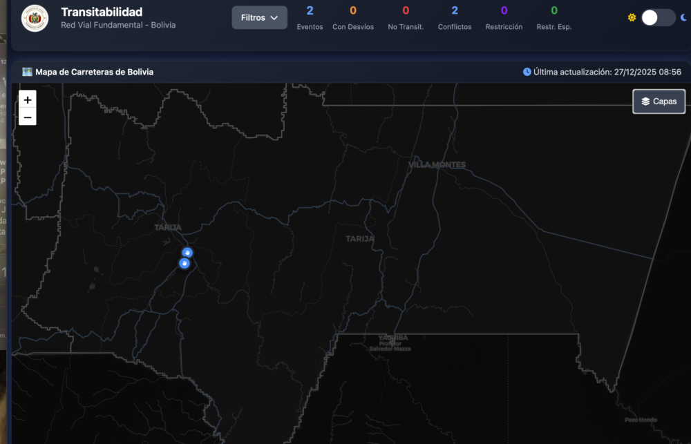 La Administradora Boliviana de Carreteras (ABC) reportó la mañana de este sábado, alrededor de las 9:25, tres vías cerradas: dos por conflictos sociales en el departamento de Tarija y una por derrumbes en La Paz.