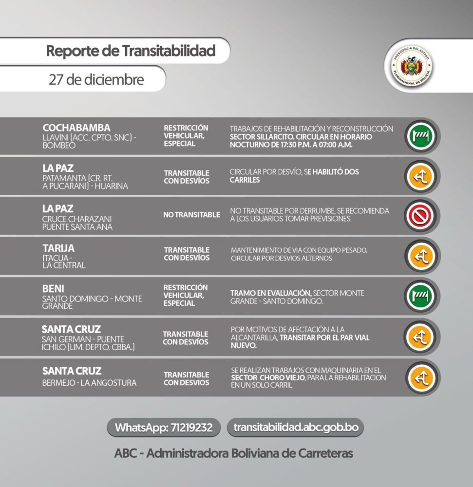 En Santa Cruz, las rutas con desvíos son San Germán–Puente Ichilo y Bermejo–La Angostura; en Tarija, Ítaca–La Central; mientras que en La Paz, Patacamaya–Huarina, según el reporte de la ABC.