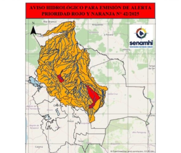 La Alerta Naranja, por ascensos repentinos y, en algunos sectores, por ascensos progresivos del caudal, comprende las cuencas de los ríos Yapacaní, San Julián, Itonoma, Mamoré, Grande, Machupo, Ichilo, Chapare, Caine, Mizque, Rocha y Beni.