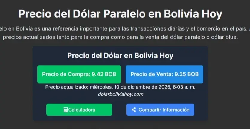 Según datos emitidos este miércoles 10 de diciembre de 2025 por el portal especializado dolarboliviahoy.com, la divisa estadounidense se cotiza en el mercado paralelo con un precio a la venta de 9.35 (BOB) y un precio de compra de 9.42 BOB.