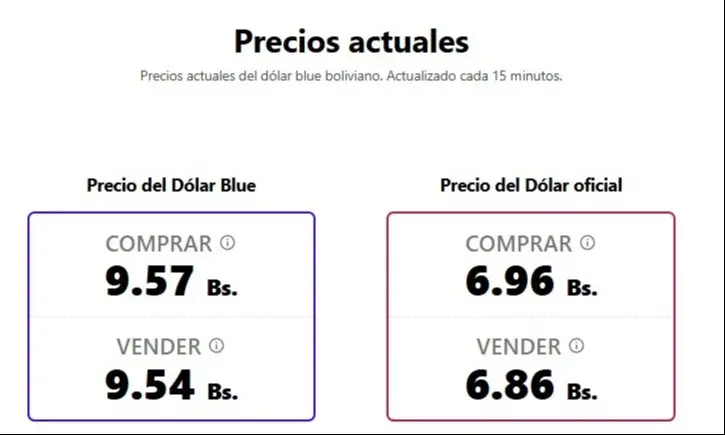 Por otro lado, según datos obtenidos por el sitio https://bolivianblue.net/#google_vignette, el dólar blue boliviano, que se actualiza cada 15 minutos, cotiza este miércoles una variación, ya que a la compra se registra en 9.57 (BOB) y 9.54 (BOB) para la venta.