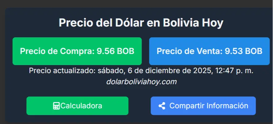 Según datos emitidos este 5 de diciembre de 2025 por el portal especializado dolarboliviahoy.com, la divisa estadounidense se cotiza en el mercado paralelo con un precio a la venta de 9.53 (BOB) y un precio de compra de 9.56 BOB.