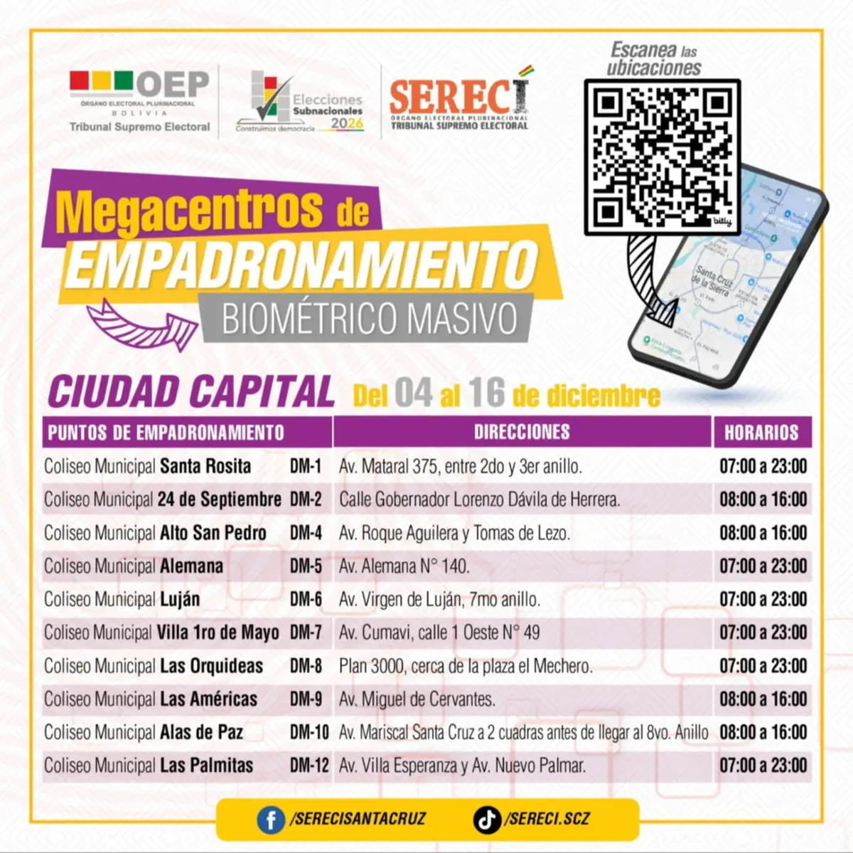 El Servicio de Registro Cívico (Sereci) informó que se desplegarán 56 puntos fijos en distintos municipios y 10 megacentros ubicados en coliseos de la capital cruceña. Seis de estos centros funcionarán en horario extendido, de 07:30 a 23:00, mientras que los otros cuatro atenderán de 08:00 a 16:00.