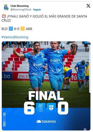 Blooming recuperó su lugar en el torneo ‘todos contra todos’ de la División Profesional con una aplastante victoria por 6-0 a la Academia del Balompié Boliviano, este miércoles en el estadio de Real Santa Cruz.