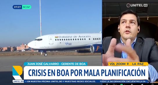 La estatal Boliviana de Aviación (BoA) reconoció que tiene dificultades en las operaciones de este mes. El gerente de BoA, Juan José Galvarro, confirmó a la red UNITEL que las operaciones se cumplen casi con la mitad de su capacidad y dijo que, de hecho, en noviembre solo 8 naves volaron, porque las otras, un total de 12, estaban en mantenimiento o esperando repuesto.