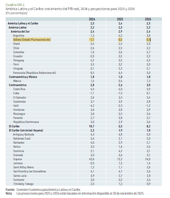 “Mientras que en el Estado plurinacional de Bolivia y el Uruguay se espera que el crecimiento en 2026 sea similar al registrado en 2025 (del 0,5%). En el resto de los países de la subregión se espera para 2026 una desaceleración del crecimiento respecto de 2025”, señala el Balance Preliminar de las Economías de América Latina y el Caribe 2025 que presentó la Cepal.