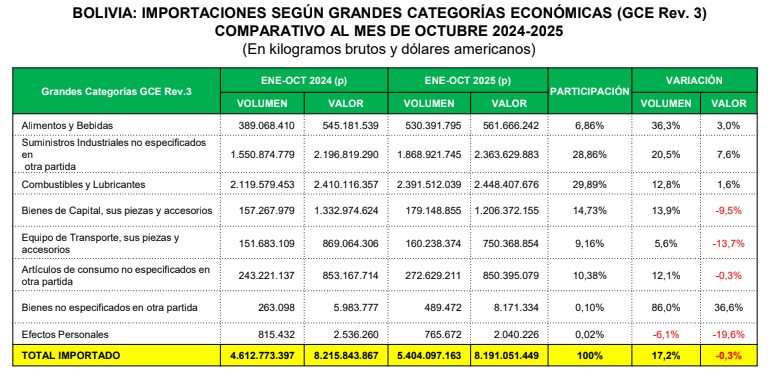 Al mes de octubre, las importaciones de Bolivia sumaron $us 8.191 millones de los cuales el 60% corresponde a la compra de suministros industriales y combustibles, revelan los datos del Instituto Nacional de Estadística (INE) procesados por el privado Instituto Boliviano de Comercio Exterior (IBCE).