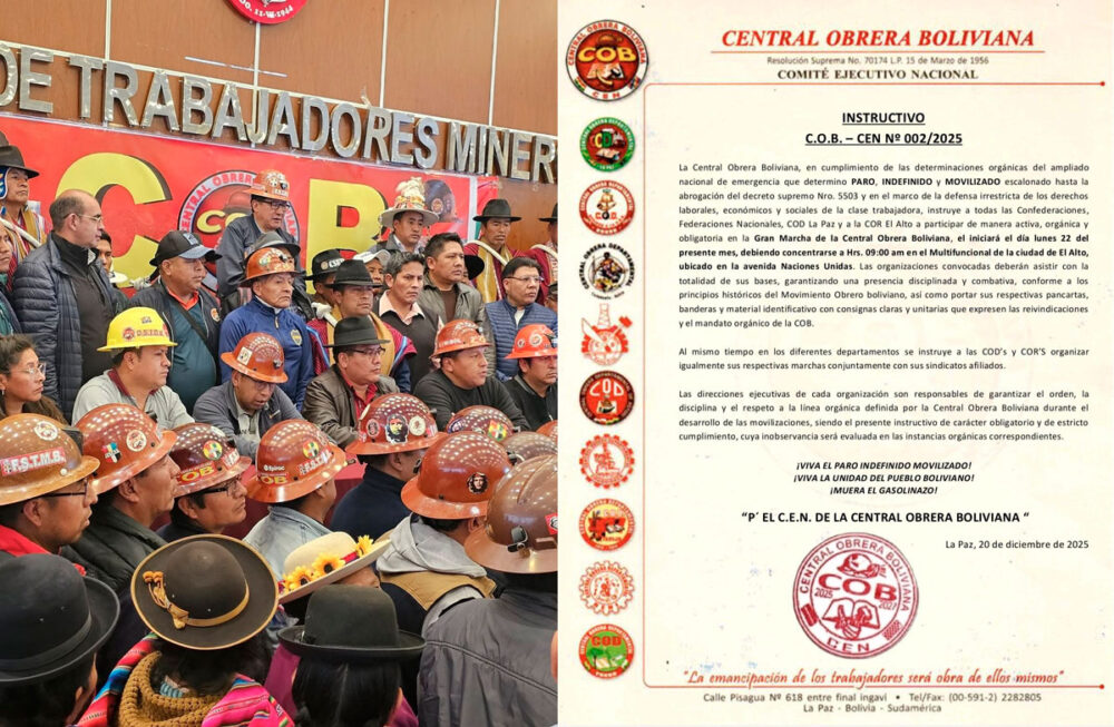 “Las organizaciones convocadas deberán asistir con la totalidad de sus bases, garantizando una presencia disciplinada y combativa, conforme a los principios históricos del Movimiento Obrero boliviano, así como portar sus respectivas pancartas, banderas y material identificativo con consignas claras y unitarias que expresen las reivindicaciones y el mandato orgánico de la COB”, dice el instructivo emitido este sábado.