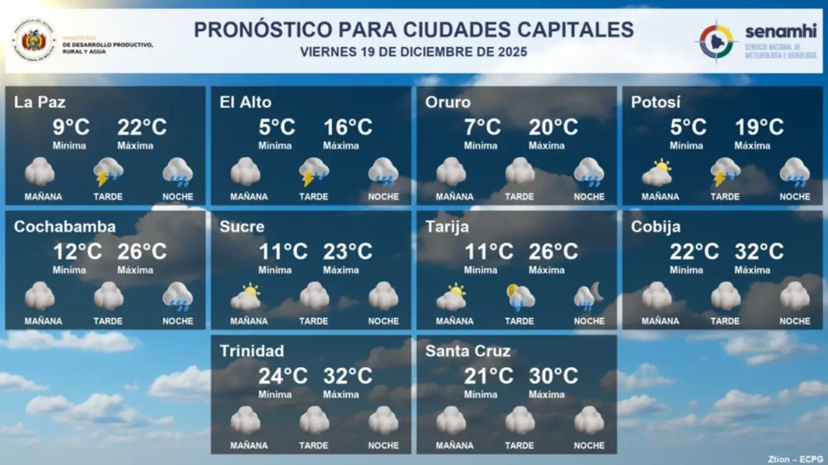 Según el Servicio Nacional de Meteorología e Hidrología (Senamhi), el clima en las ciudades capitales de Bolivia será variado con tendencia a lluvias y tormentas eléctricas en la mayoría de las ciudades capitales este viernes 19 de diciembre.