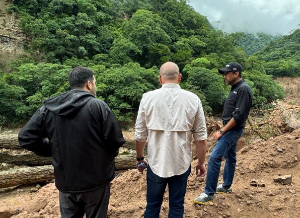 El gobernador Luis Fernando Camacho, junto al secretario de Desarrollo Económico, Pablo Sauto, y el director del Servicio Departamental de Caminos (Sedcam), Jairo Guiteras, se trasladaron hasta la zona para coordinar y supervisar las labores que se ejecutan de manera permanente en este tramo estratégico.