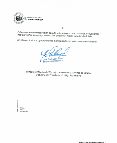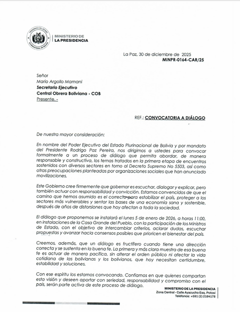 «En consecuencia, mientras no exista una invitación formal y coherente, debidamente notificada, con una agenda concreta y garantías de trato digno, la COB dará continuidad a las determinaciones orgánicas que emanen de nuestros sectores, de sus ampliados, reuniones resolutivas y decisiones colectivas, en el marco del derecho a la protesta y la defensa de los intereses del pueblo trabajador», se añade en el comunicado del ente matriz.