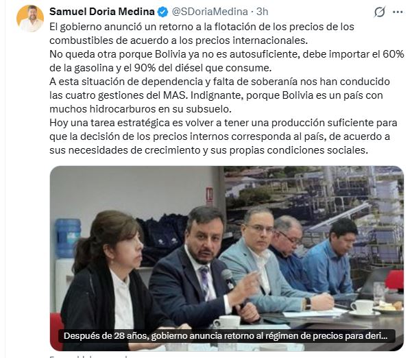 El empresario y lider de la alianza Unidad, Samuel Doria Medina afirmó que el anuncio del Gobierno sobre el retorno a la flotación de los precios de los combustibles responde a una realidad inevitable, debido a que Bolivia ya no es autosuficiente y debe importar el 60% de la gasolina y el 90% del diésel que consume.